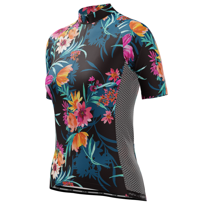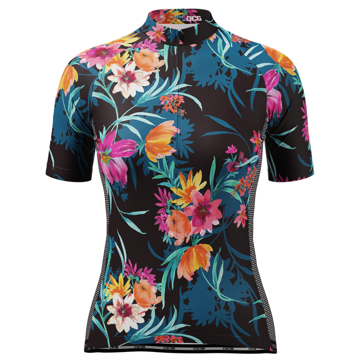 The Women's Tropical Bloom Short Sleeve Cycling Jersey features a moisture-wicking LEMBO 140 GSM polyester, cooling 110GSM mesh side panels, and reinforced stitched back pockets.