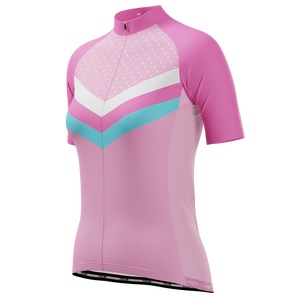 The Women's V-Series Pro Short Sleeve Cycling Jersey features a moisture-wicking LEMBO 140 GSM polyester, cooling 110GSM mesh side panels, and reinforced stitched back pockets.