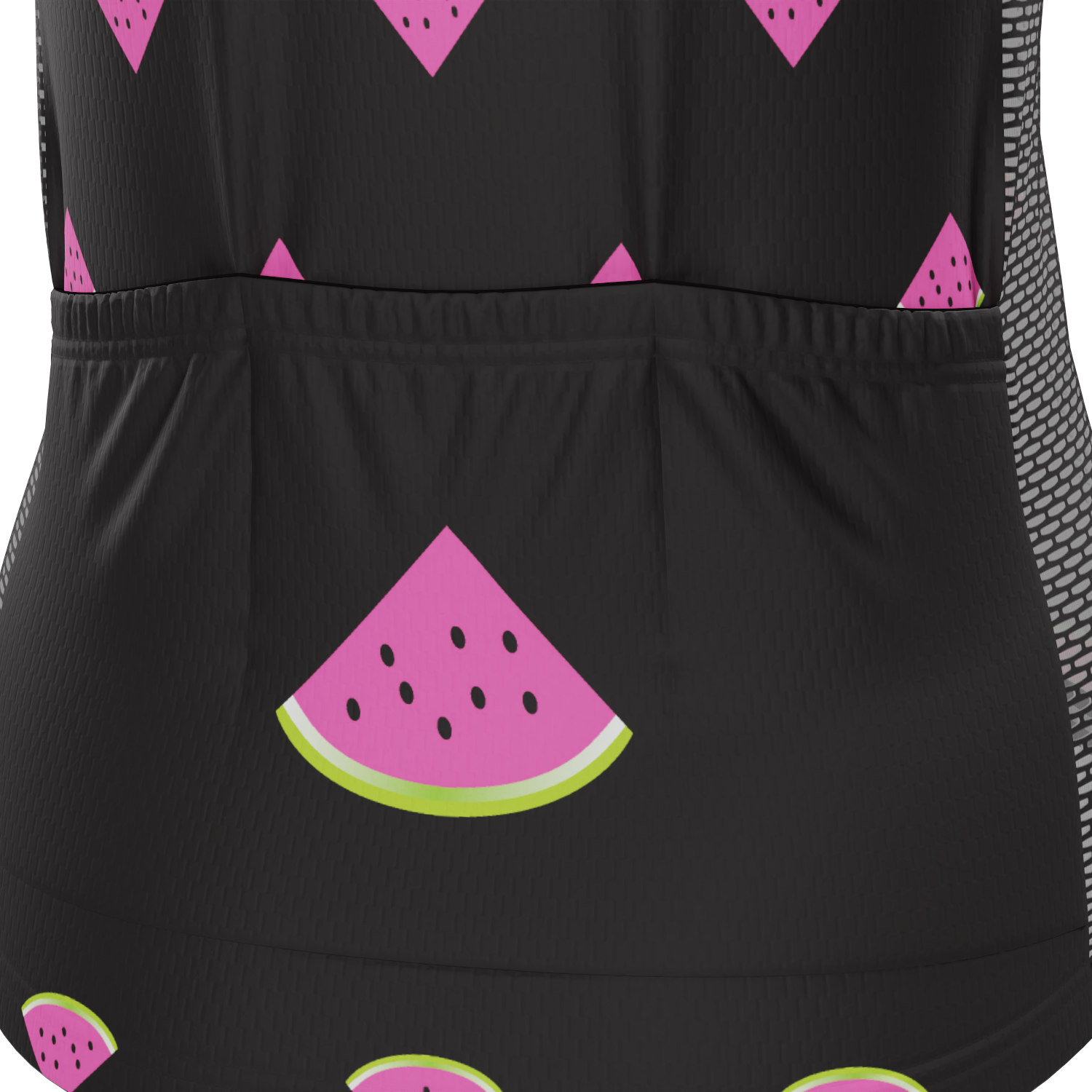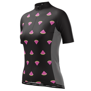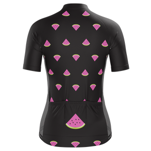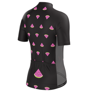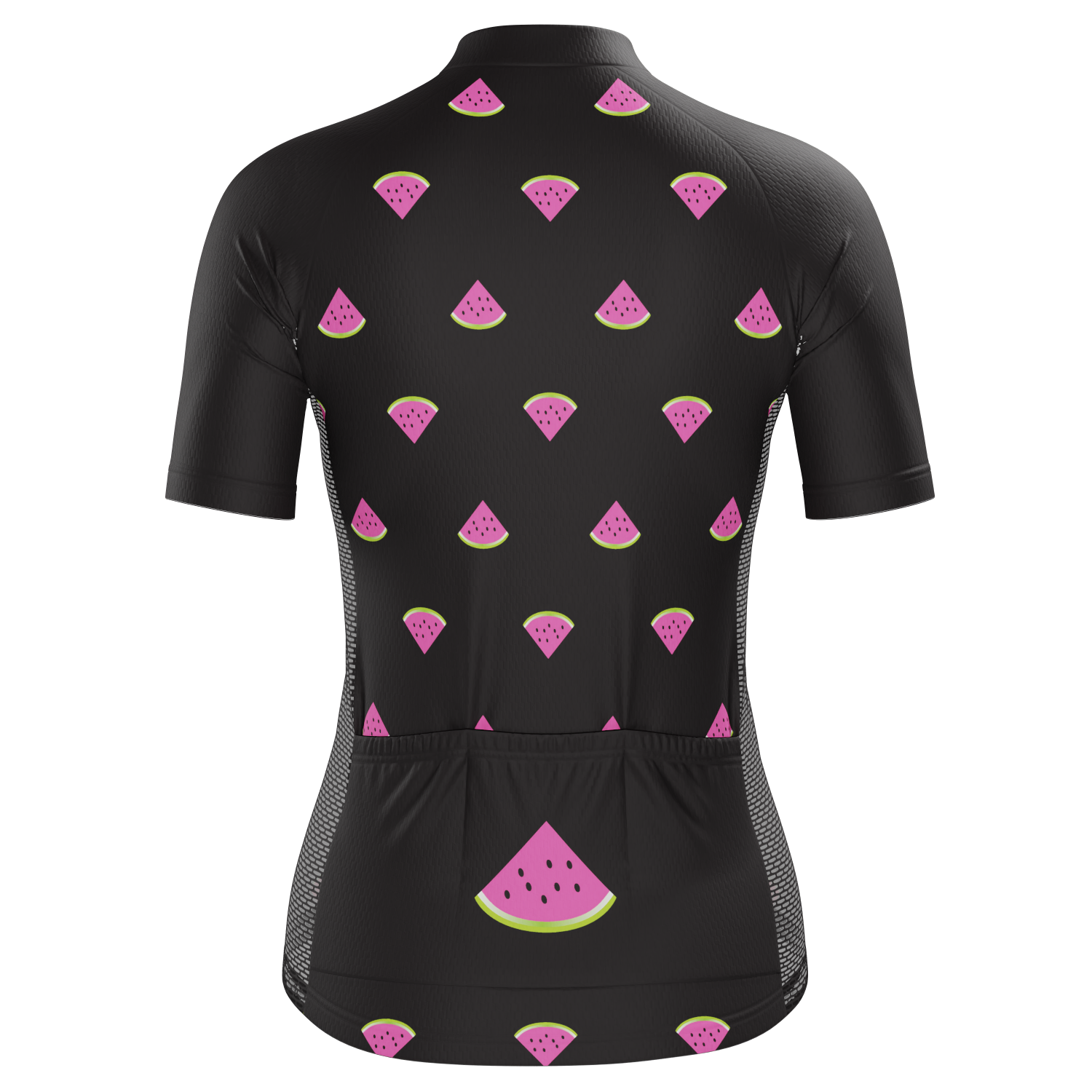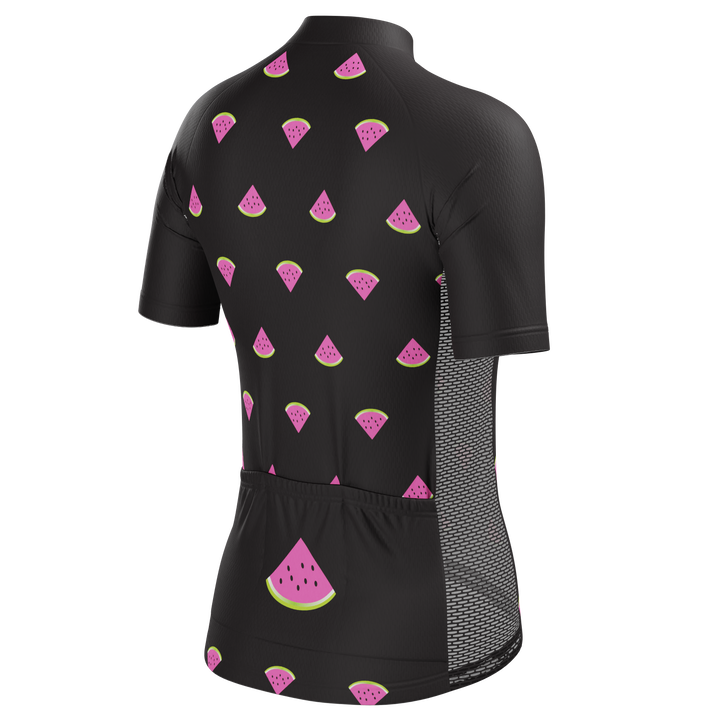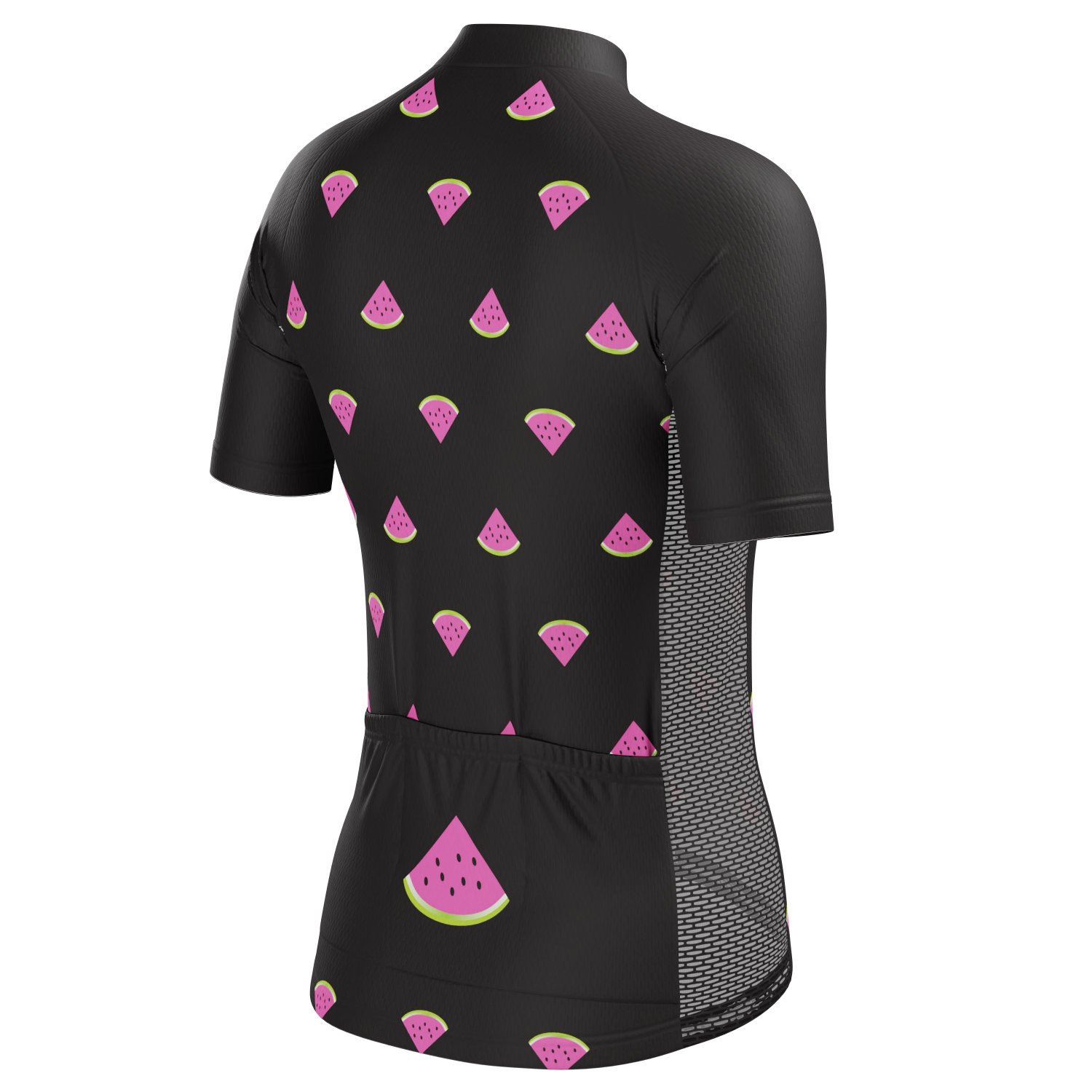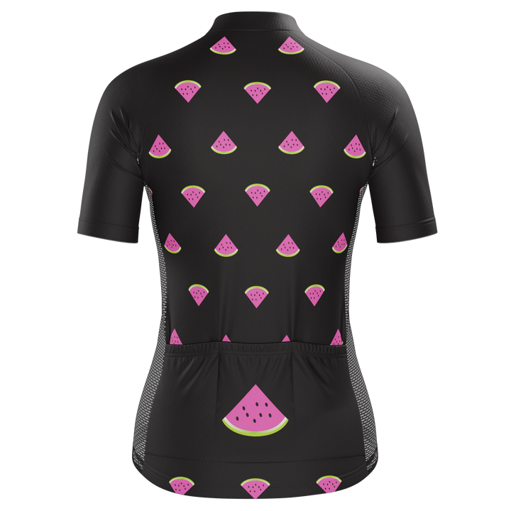 The Women's Watermelon Black Short Sleeve Cycling Jersey features a moisture-wicking LEMBO 140 GSM polyester, cooling 110GSM mesh side panels, and reinforced stitched back pockets.