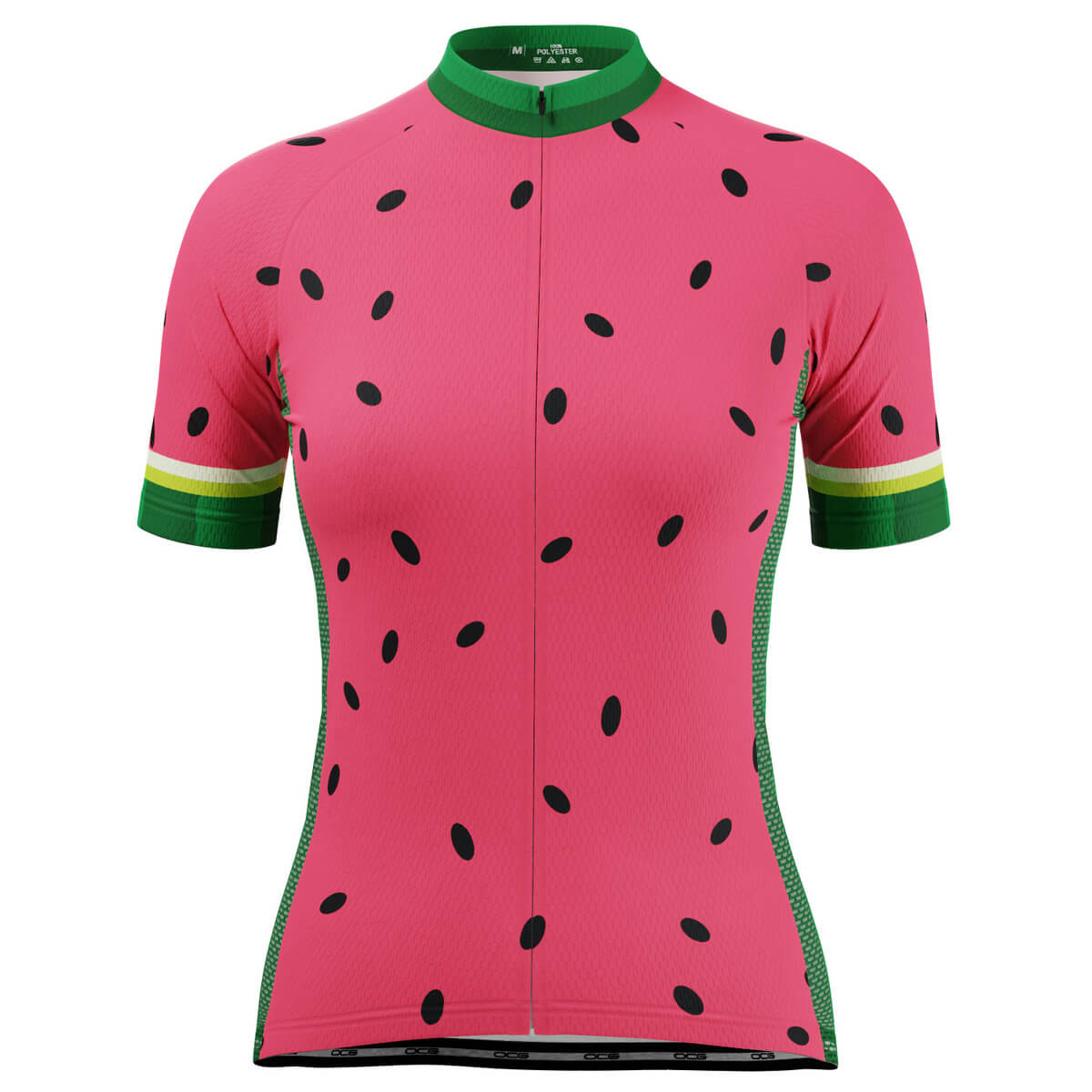 The Women's Watermelon Fruit Short Sleeve Cycling Jersey features a moisture-wicking LEMBO 140 GSM polyester, cooling 110GSM mesh side panels, and reinforced stitched back pockets.