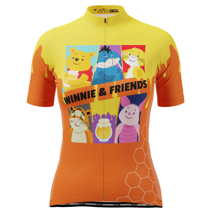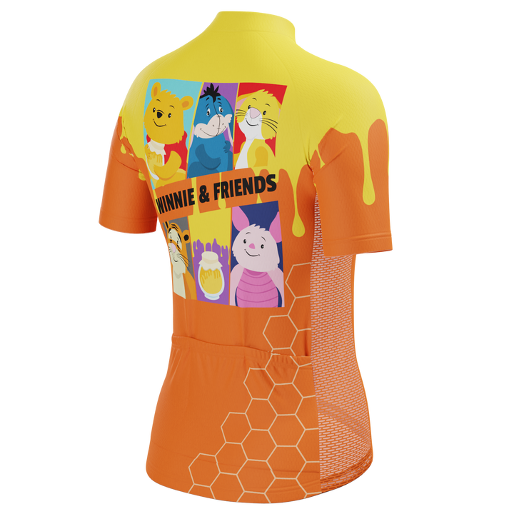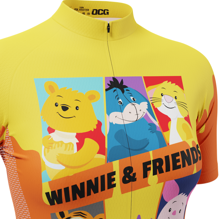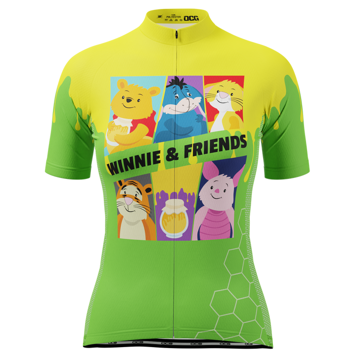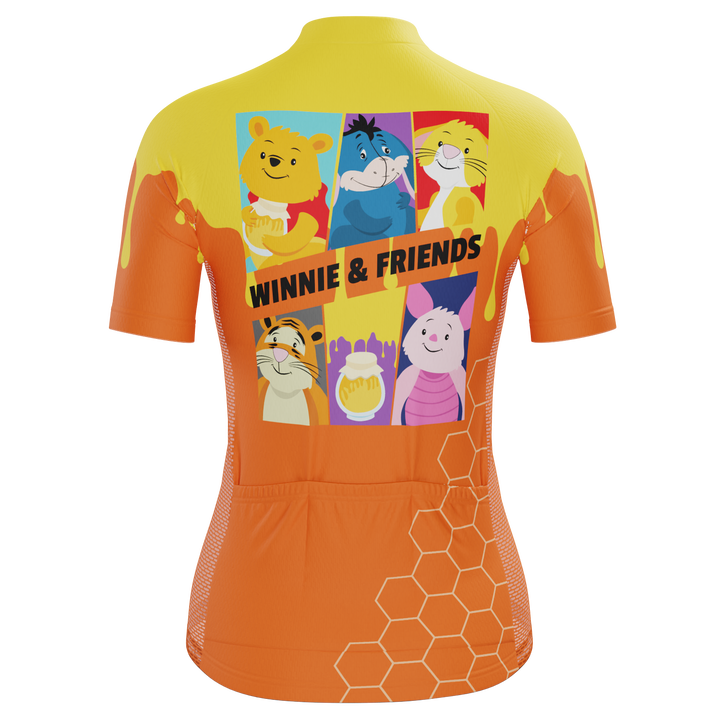The Women's Winnie & Friends Short Sleeve Cycling Jersey features a moisture-wicking LEMBO 140 GSM polyester, cooling 110GSM mesh side panels, and reinforced stitched back pockets.