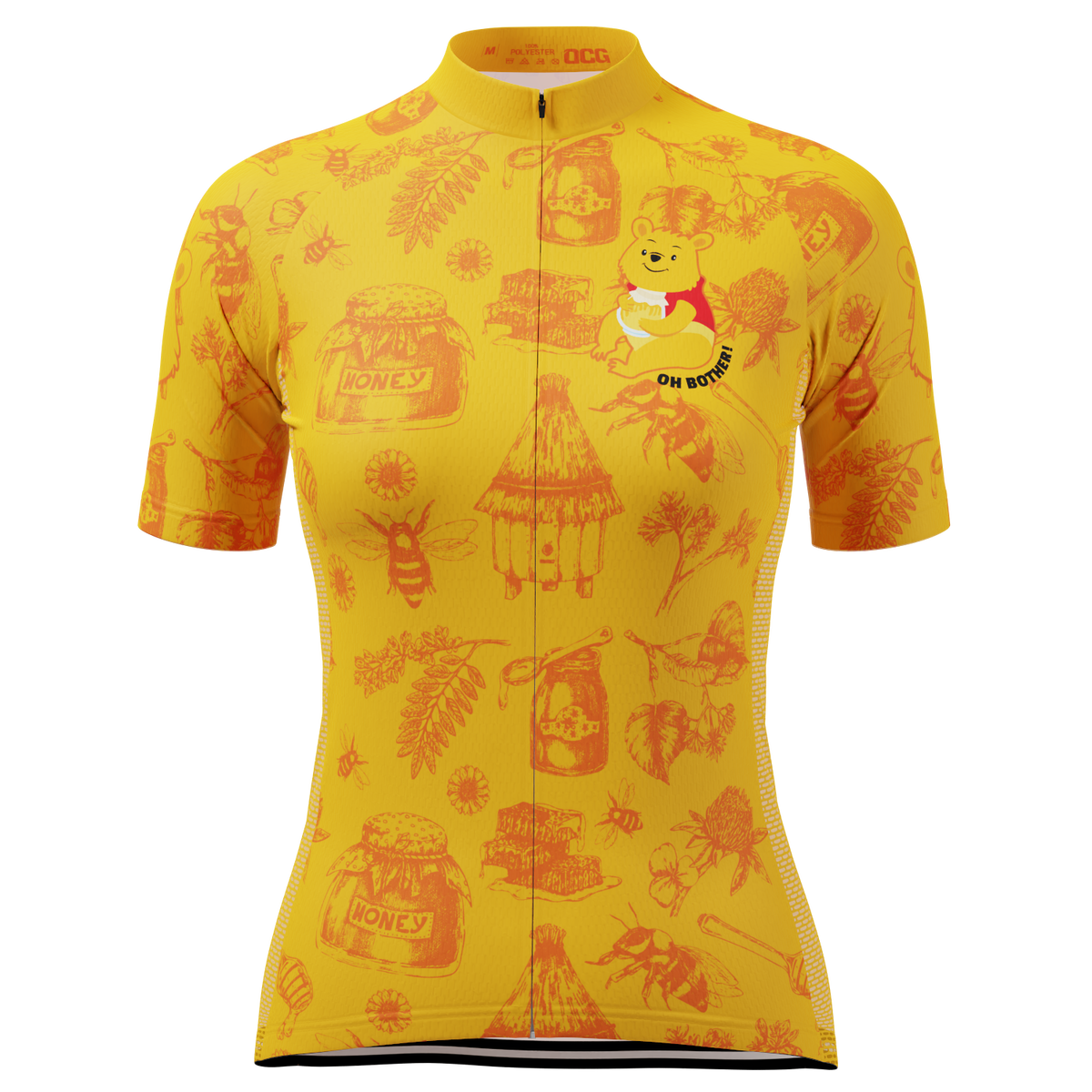 The Women's Winnie The Pooh Oh Bother! Short Sleeve Cycling Jersey features a moisture-wicking LEMBO 140 GSM polyester, cooling 110GSM mesh side panels, and reinforced stitched back pockets.