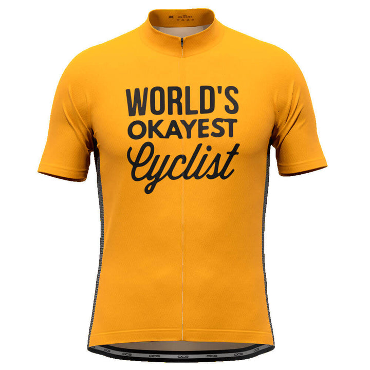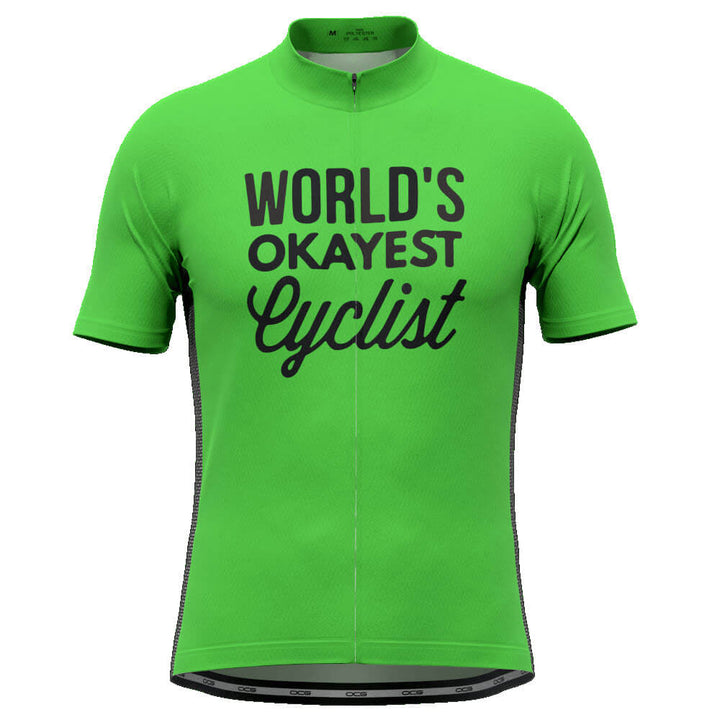 The jersey is designed with a slim fit that contours to your body for a flattering look. The raglan sleeves provide a full range of motion, while the elastic hem helps keep the jersey in place. The fabric is also treated with a moisture-wicking finish to keep you dry and comfortable. The jersey is finished with a bold "World's Okayest Cyclist" graphic on the chest, making it a great choice for any cyclist looking to make a statement.